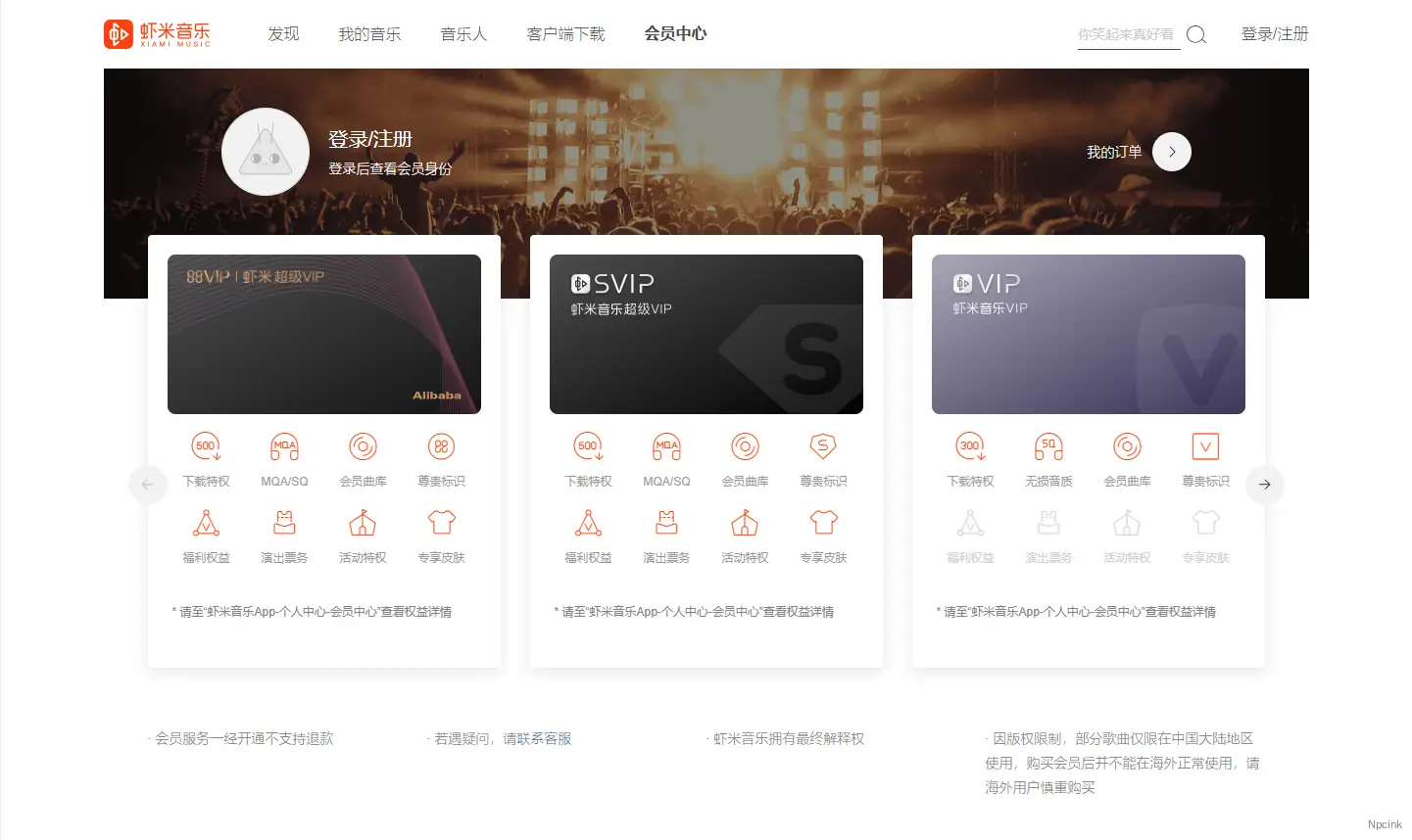 这是一款来自虾米音乐用户中心的WordPress区块,顶部是背景图,下面的是权益模块,图文混排,布局合理,各类权益信息一目了然。