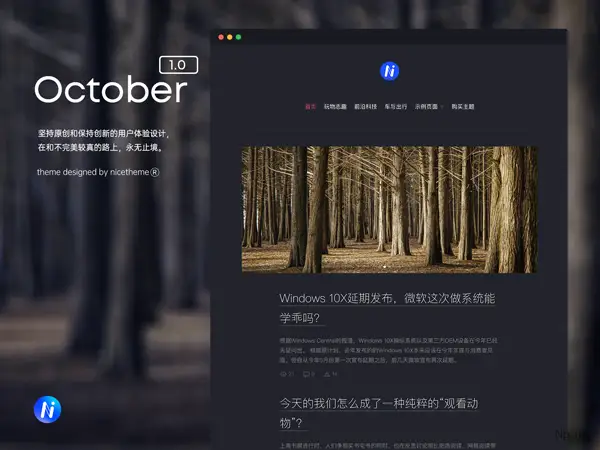 October是一款由NICETHEME开发的WordPress个人博客主题,采用单栏至简设计风格,适合写作与生活记录。主题亮点包括沉浸式对话框评论系统、全局夜晚模式、背景替换功能和响应式设计。支持中英双语切换、2种文章样式和自动加载列表,内置专题栏目和多样化广告位。提供永久免费更新、详尽教程文档和模块化后台配置,授权1个主域名使用。主题兼容所有设备并支持高清显示,帮助用户快速搭建个性化博客网站。